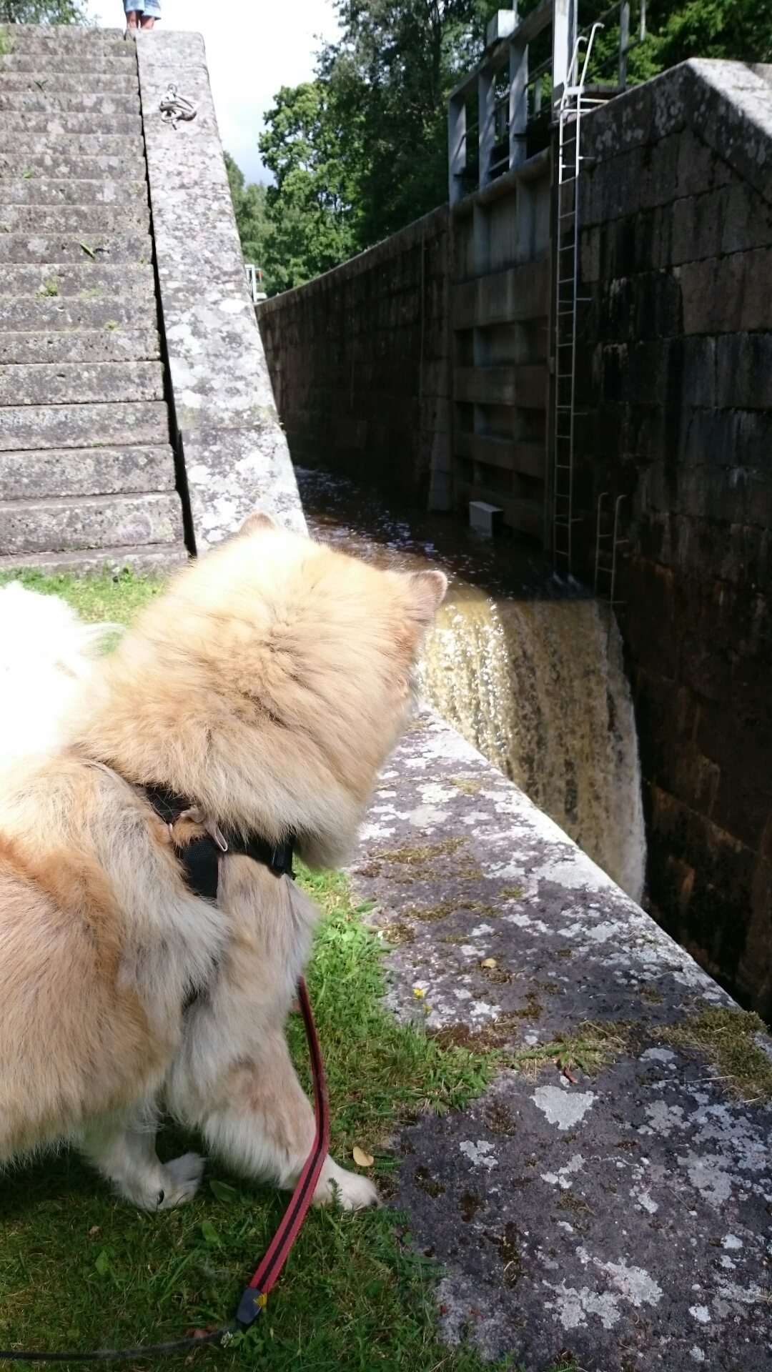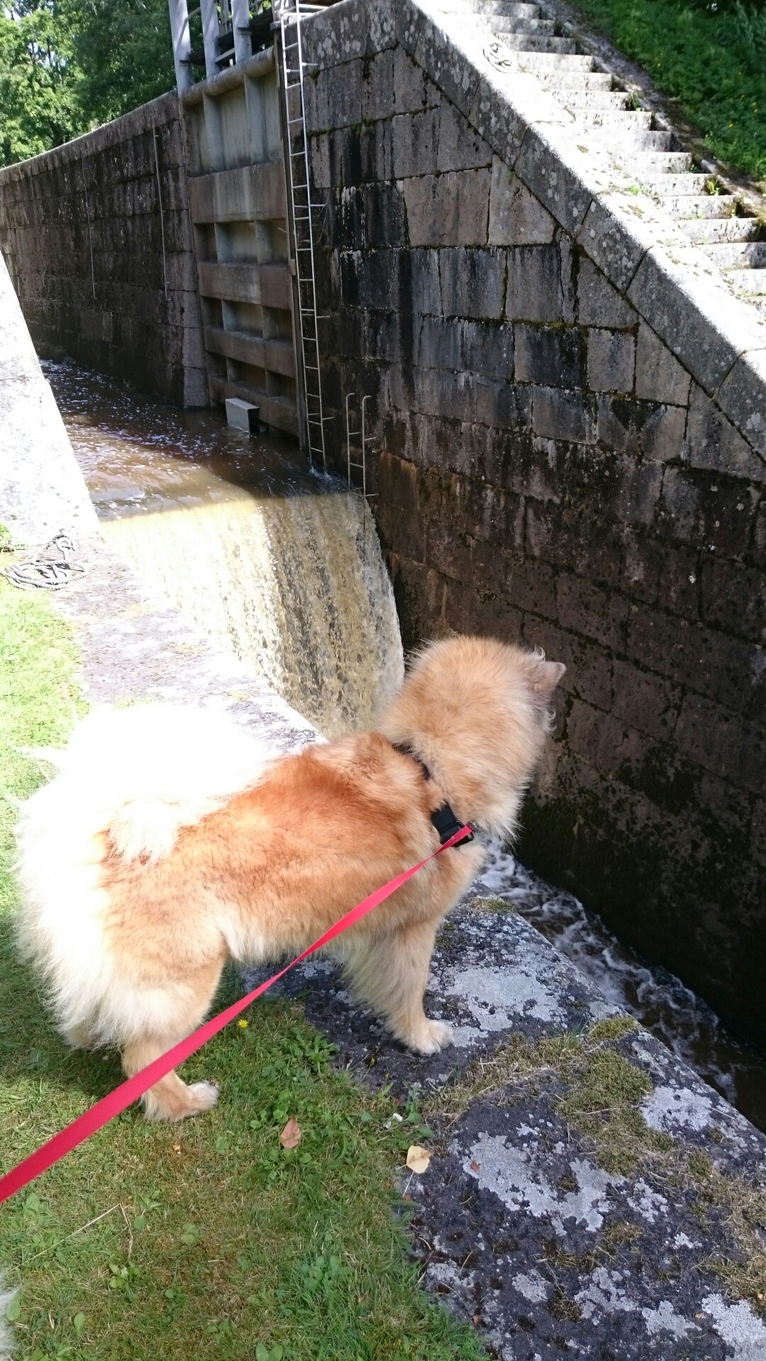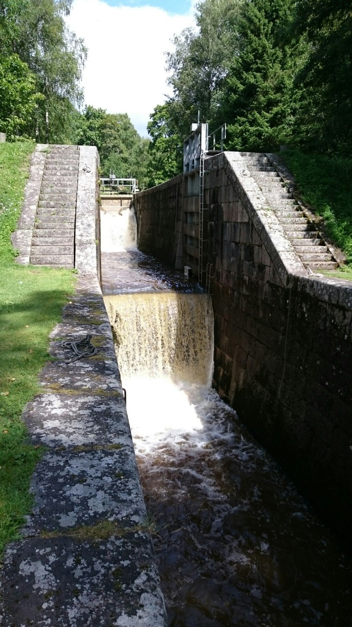 Och vi hade tur att komma precis när tre båtar skulle slussas och vattnet släpptes på..