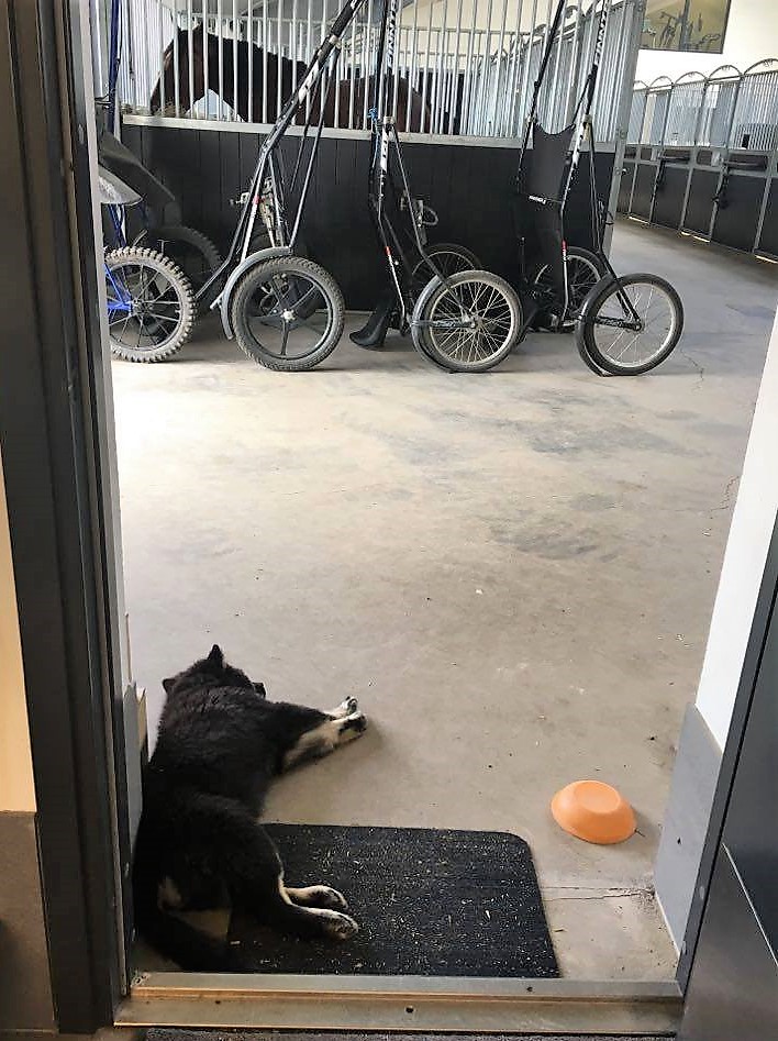 Hänga i stallet hela dagarna, inga problem där heller. Går alltid lös och håller sig hela tiden utanför kontorsdörren, ja när hon inte inspekterar hästarna som kommer in i stallet då vill säga 😉