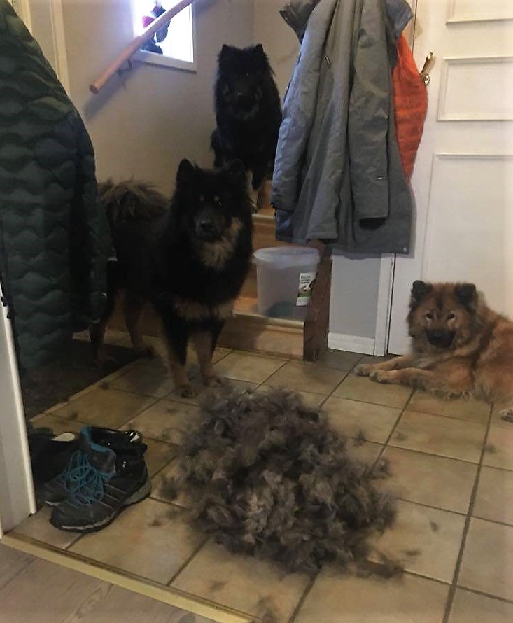 Japp, en total utfällning står denna gång på schemat och det är något som hon definitivt inte gör vid varje fällning. Men det spelar ju ingen större roll oavsett, det är ju inte så att vi ska på någon utställning eller så inom den närmaste tiden 😉 . Och när vi ändå är inne på ämnet ”päls” är inte steget stort till pälsvård och därmed dagens morgontvätt..