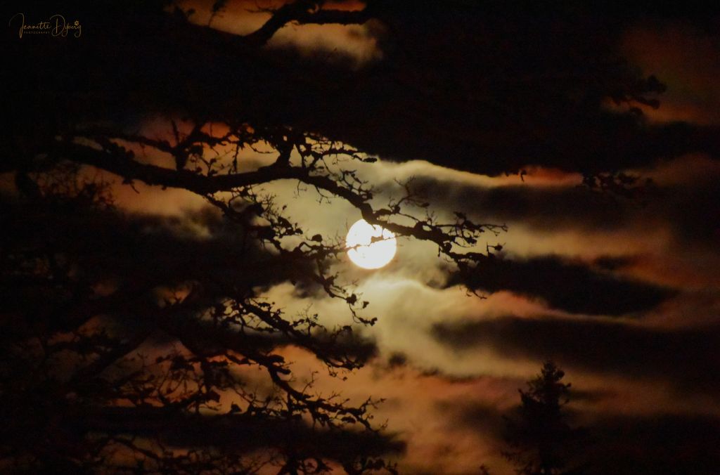 Himlen bjöd på ett litet skådespel här för en stund sedan då månen sakta steg upp bakom de gamla ekarna…