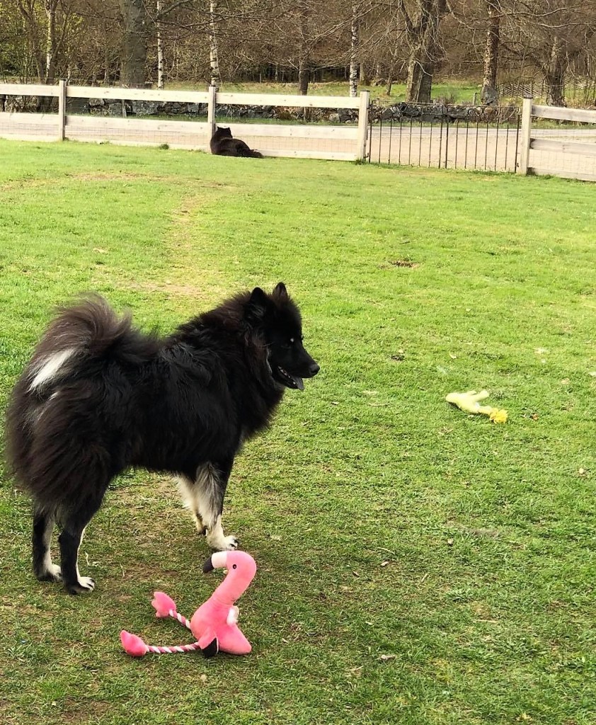 Ja iallafall om man har en Malou i huset, eller rättare sagt i detta fallet, i trädgården 😉 . Hon ser det som sin uppgift att dekorera denna med allsköns saker, allt ifrån pinnar till leksaker, och det räcker inte med en sak av varje. Nej, mycket ska det vara och allt ska ligga utspritt lite här och var. Med andra ord så är det inte städat i en handvändning om man nu säger så när det är dags för gräsklippning 😉 . Så det gäller att vara effektiv och snabbt få upp allt på altanen för att sedan lika raskt få igång klipparen! För så länge den går så håller hon fokus på mig och låter saker och ting vara och då blir gräsmattan så här ren och fin 🙂