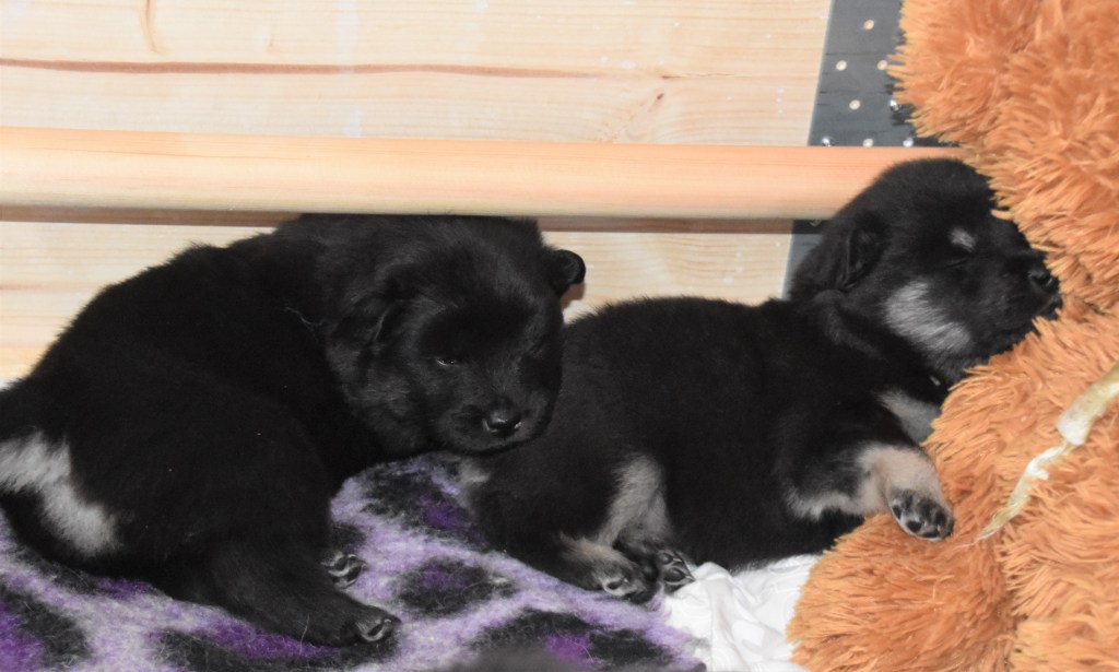 Idag är gänget tre veckor och det har varit en stor dag i deras liv! Första besöket av blivande valpköpare har varit här och både Malou och bebbarna skötte sig med glans. Tack Camilla, Lars-Owe, Linnéa & Jakob för mysigt besök samt den fina blomman ❤ . Och idag var det även dags för första smak-portionen och den slank ner i en hast, inget kräset gäng här precis 😉