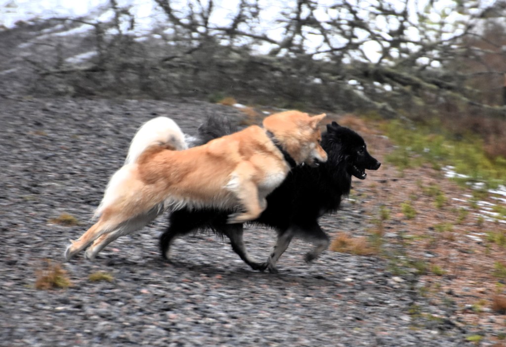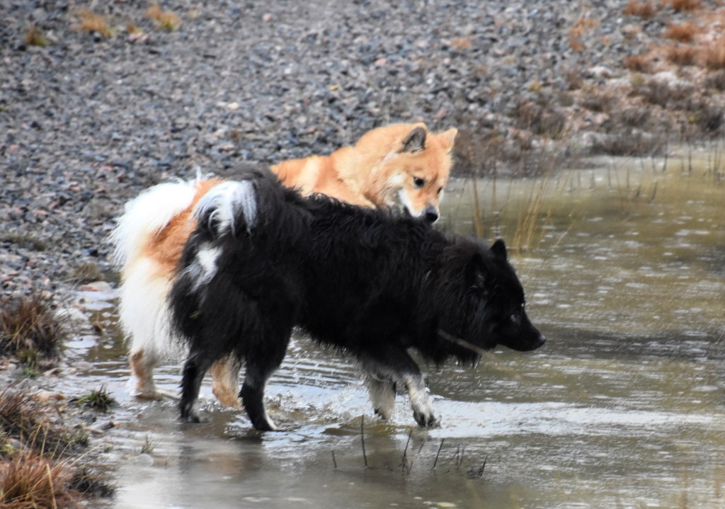 Ett gott skratt för oss tvåbenta blev det allt men jag tror inte Elli riktigt håller med 😉 . Men när hon kom över detta blöta nederlag så blev det bus med bästisen Malou istället, säkert minst lika kul, det såg ut så iallafall 🙂