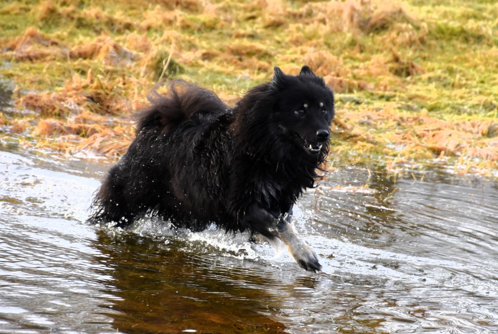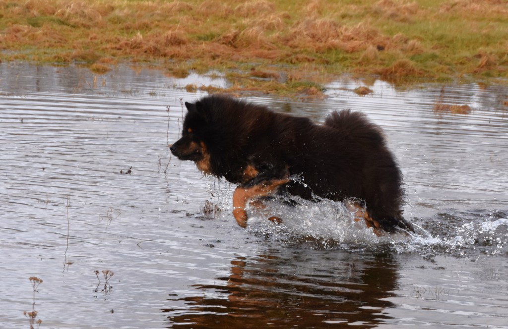Som jag skrev häromdagen så har vi blivit med damm här på vår äng och det till våra badankors stora glädje 😀 . Ett litet smolk i bägaren för Jill var dock det faktum att i lördags låg det fortfarande is på dammen, inte okej i hennes värld 😉 men i söndags var det äntligen öppet vatten och det nyttjades till max av våra badgalningar 😉 😀