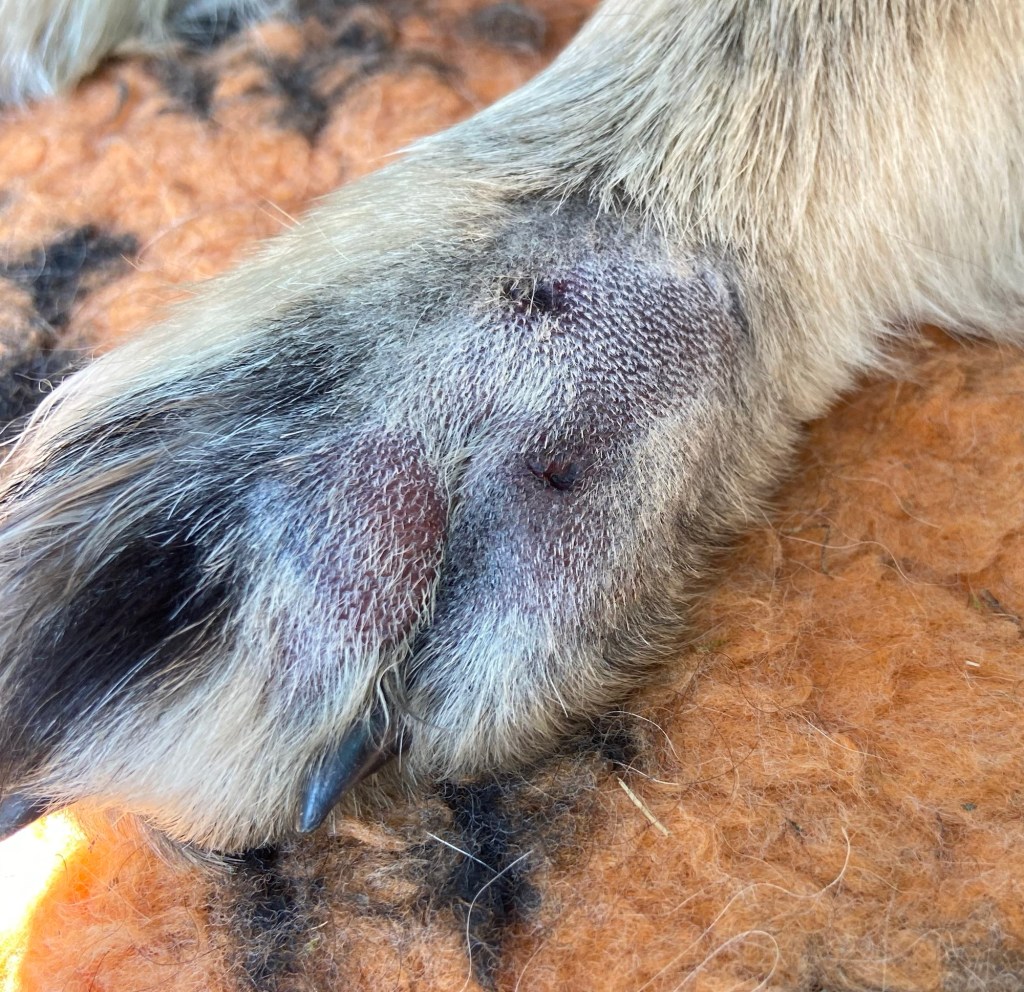 EKG visade att hjärtat nu mår väl men benet är som ni ser fortfarande lite svullet men det ska ge med sig kommande dagar och tassen nedan visar på ett tydligt bevis på att det var ett rejält ormbett hon råkade ut för 😢