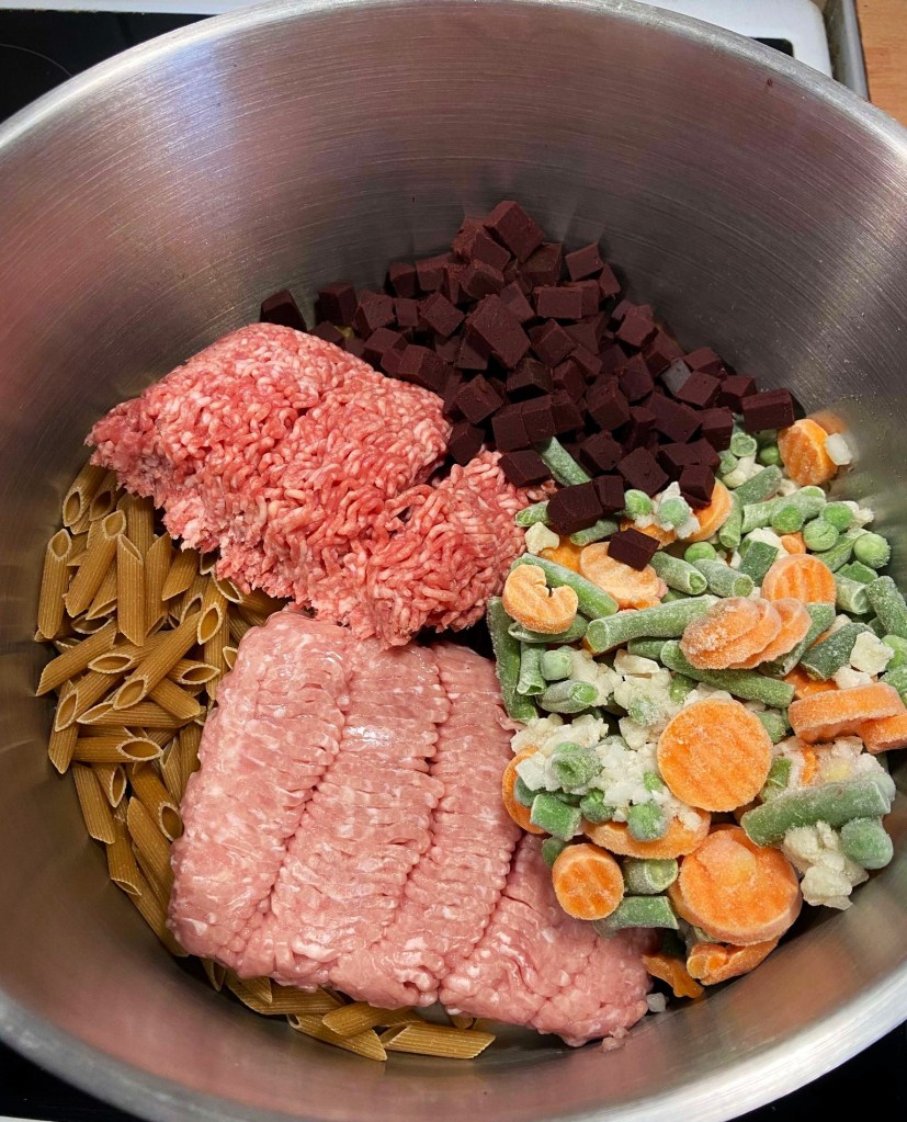 Jag har även idag haft lyxen att jobba hemifrån och det är inte klokt så mycket mer tid man får då. Jag menar, man är ju hemma samma minut som man slutar för dagen, inte dumt alls 😉 . Och denna extratid användes till att laga hundmat och idag blev det en gryta på kyckling- samt blandfärs, frysta grönsaker, fullkornspasta samt blodpudding som fick puttra ihop i några liter vatten i ca 1 timme 🙂