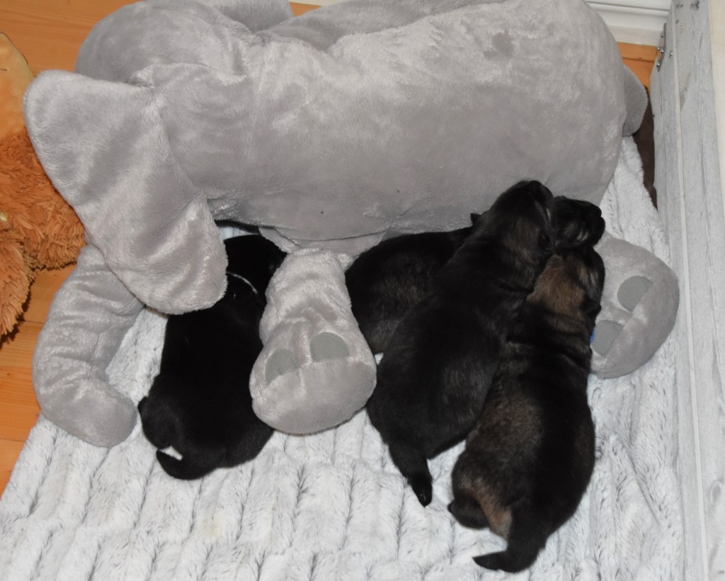 Eller som vid dagens städning av valplådan då hela gänget kröp intill elefanten tills jag var klar 🙂