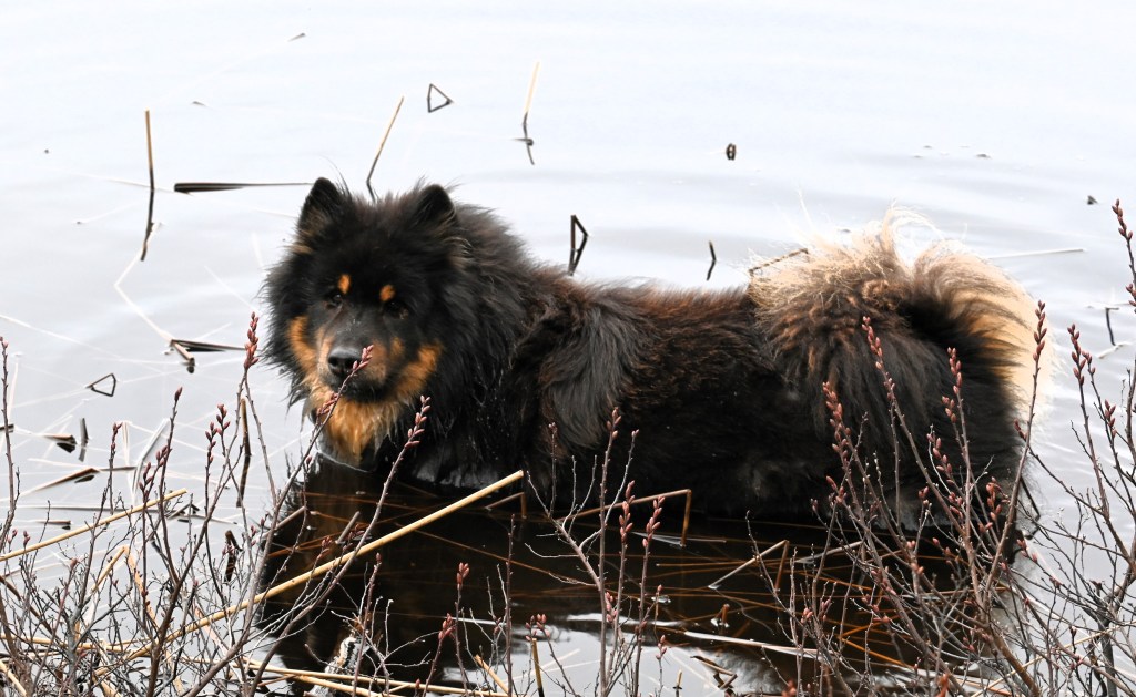 Nej ni ser ju, dimmigt och grått utan det minsta spår av solen som nu öser sina sköna strålar över oss. Men men, varmt var det ändå, ja till och med såpass varmt att jackan fick öppnas 😉 . Och Jill fick allt lite vårfeelning och tog sig ett dopp även om solen inte visade sig 🙂