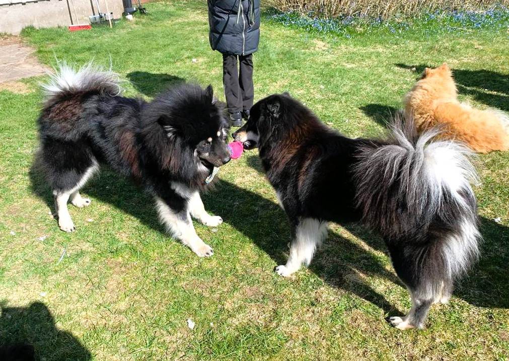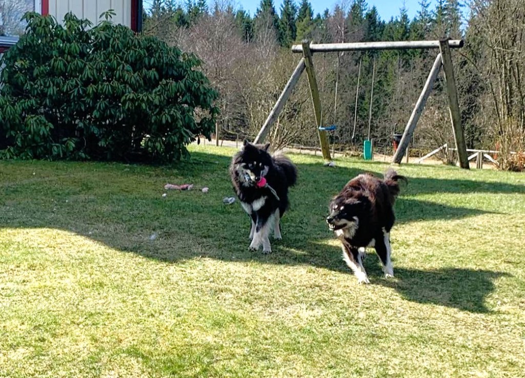..för att sedan följas av mycket hundbus i trädgården. Visst är Zuberba-gänget vuxna nu, lite över två år gamla men leklust som valpar har de ändå 😉 😀