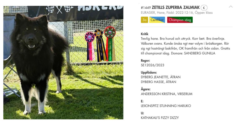 Såå stolt uppfödare idag till Zetills’ Zuberba Zalmiak ”Zalle” som tog sitt 3:e cert och därmed blev Svensk utställningschampion. Vår första egenuppfödda champion, det är stort det ska ni veta <3.