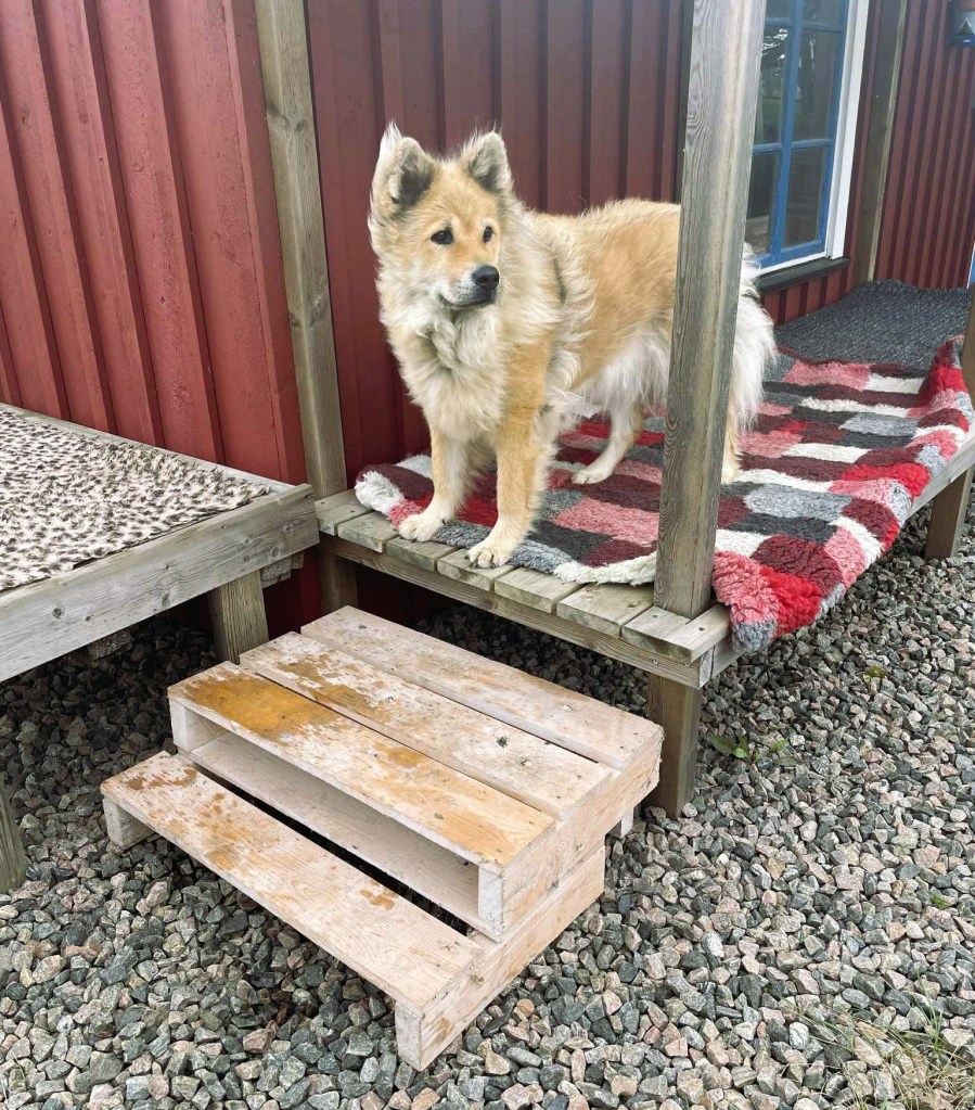 Och i hundgården har husse fått fixa till en egen liten trappa till damen så att hon säkert kan ligga mjukt och torrt..